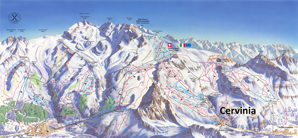 Cervinia - Aosta Valley - Italy Cervinia is situated on the Italian side of the majestic Matterhorn. With a village elevation of over 2000m, this is one of the highest Ski Areas in Europe. The top ski runs start at close to 3900m, giving the area a Snow Sure feature from early December till mid April. Cervinia itself has 150km of prepared runs to the village and a Total of 350km available through the lift-link to Zermatt.